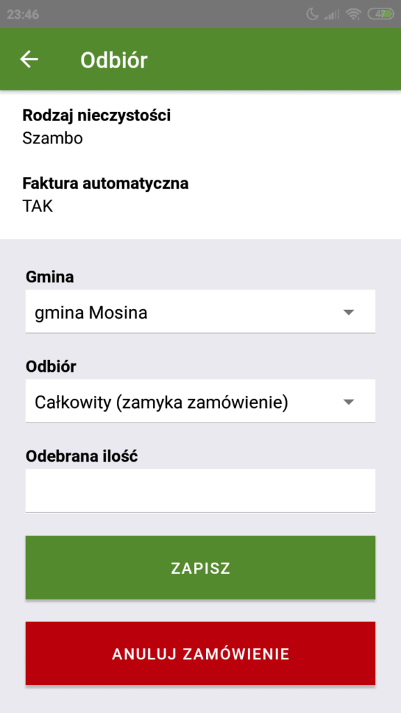 Jeśli klient korzysta z aplikacji szambo.online istnieje możliwość rozliczania się za pośrednictwem aplikacji. Zarówno umowa z nowym klientem, jak i faktury generowane są wówczas automatycznie w formie elektronicznej. Elektroniczna faktura jest wysyłana na adres e-mailowy klienta.